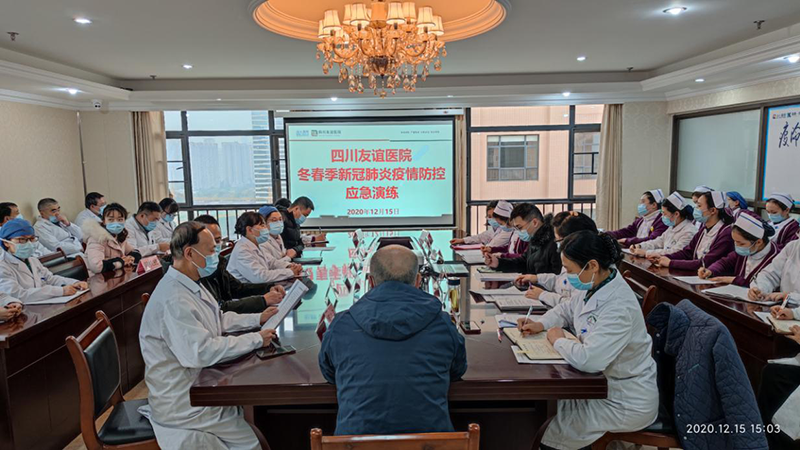 为有效防范和积极应对2020年冬春季可能出现的新冠肺炎疫情,做好疫情防控准备,提升医院各部门应对新冠肺炎疫情的应急响应能力,精准、科学、有效应对新冠肺炎疫情。2020年12月15日下午,四川友谊医院在B栋16楼行政会议室开展了冬春季新冠肺炎疫情防控应急演练。医务部、护理部、院感科、检验科、采购部、药剂科、总务科、呼吸科、急诊科、司机班等相关科室工作人员共60余人参演,院领导班子全程指导演练,各临床科室主任、护士长参与现场观摩。