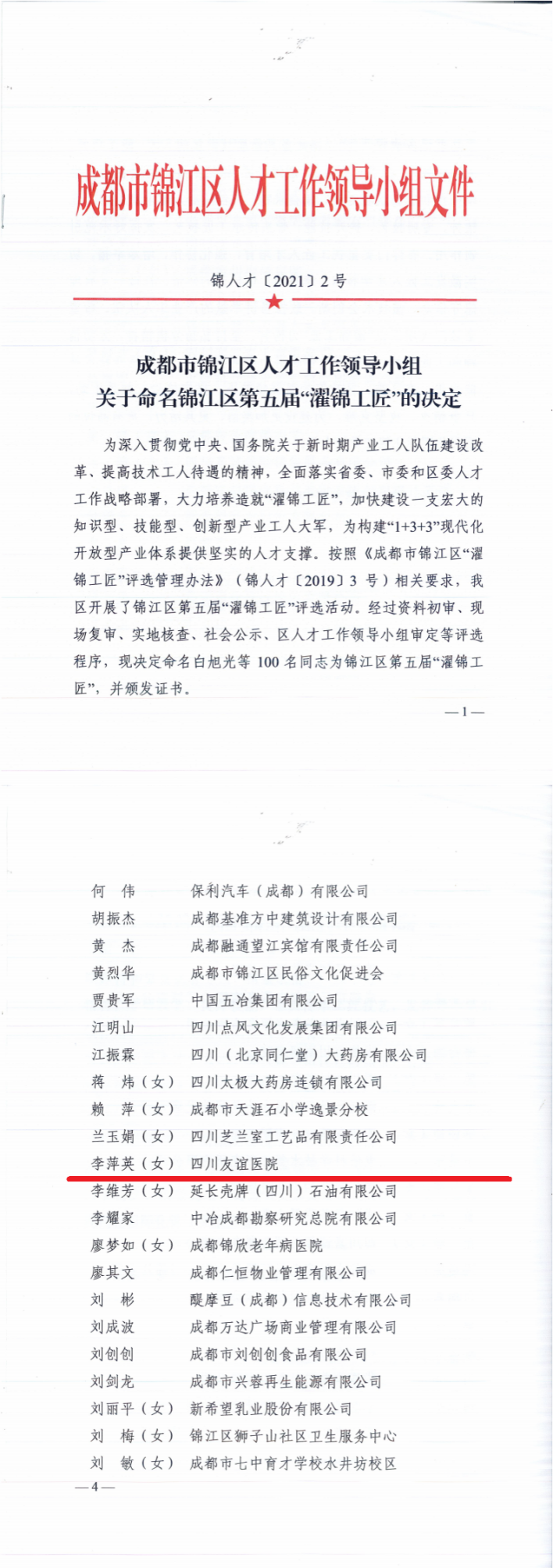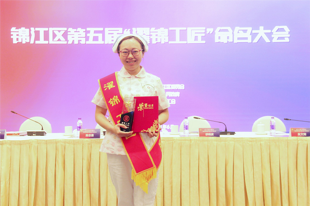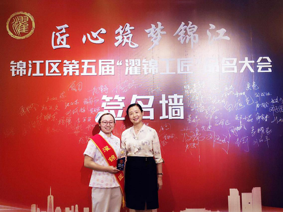 2021年6月2日,四川友谊医院肿瘤科科护士长兼肿瘤一病区护士长李萍英同志被锦江区人才工作领导小组办公室命名为2021年第五届“濯锦工匠”。6月15日,四川友谊医院副院长赵丽君受邀与护士长李萍英一同出席了锦江区第五届“濯锦工匠”命名大会。 在医院肿瘤科一病区工作的李萍英,始终坚持着医院“医患合一”的服务理念,传承着“守护大众健康”的宗旨,耐心、细心、用心地服务好每一位来院患者。她表示,接下来的工作中她将以传播护理工匠精神为己任,在工作岗位上更加自律,更加奋进,为友谊医院的发展贡献出自己的一份力量。