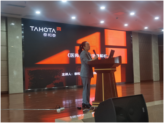 培训由医院法律顾问泰和泰律师事务所刘莉执业律师主讲,刘莉律师对新修订的《医师法》做了较为详细的解读,阐述了《医师法》修订的特点,对重点条款进行了详细的解读,例如:自愿救助责任豁免;超说明书用药;行政处罚方式;中西医诊疗技术互通;强制报告;多点执业与便捷执业等。