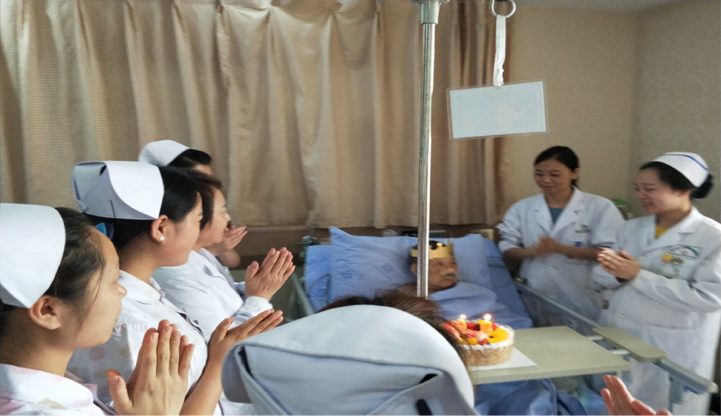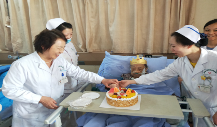 科主任熊瑛教授偶然得知吴婆婆90岁生日的消息,便安排科室策划为婆婆过一个特别的生日。当吴婆婆接过生日蛋糕时,婆婆及家属都非常感动,现场洋溢着温馨的场面,婆婆脸上一直挂着幸福的笑容,并且一直拉着熊瑛主任的手不停的表示谢谢,最后医护人员与家属一起共同为婆婆唱起了生日快乐歌……